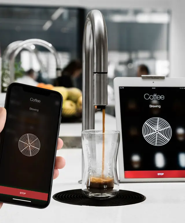 Staff and visitors make drinks to their exact requirements through the iPad set into the worktop or through the app on their phone.